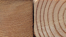 New growth wood is cut from trees that have been harvested from trees grown in open areas with little competition for sun light from other trees. This causes the trees to grow very quickly and fast growing species like Pine are selected to be grown in these tree farms. These trees are harvested in 10 - 20 years, and as you can see from the picture above, new growth wood has wide open growth rings, thereby making it more prone to wood rot and pest infestation.